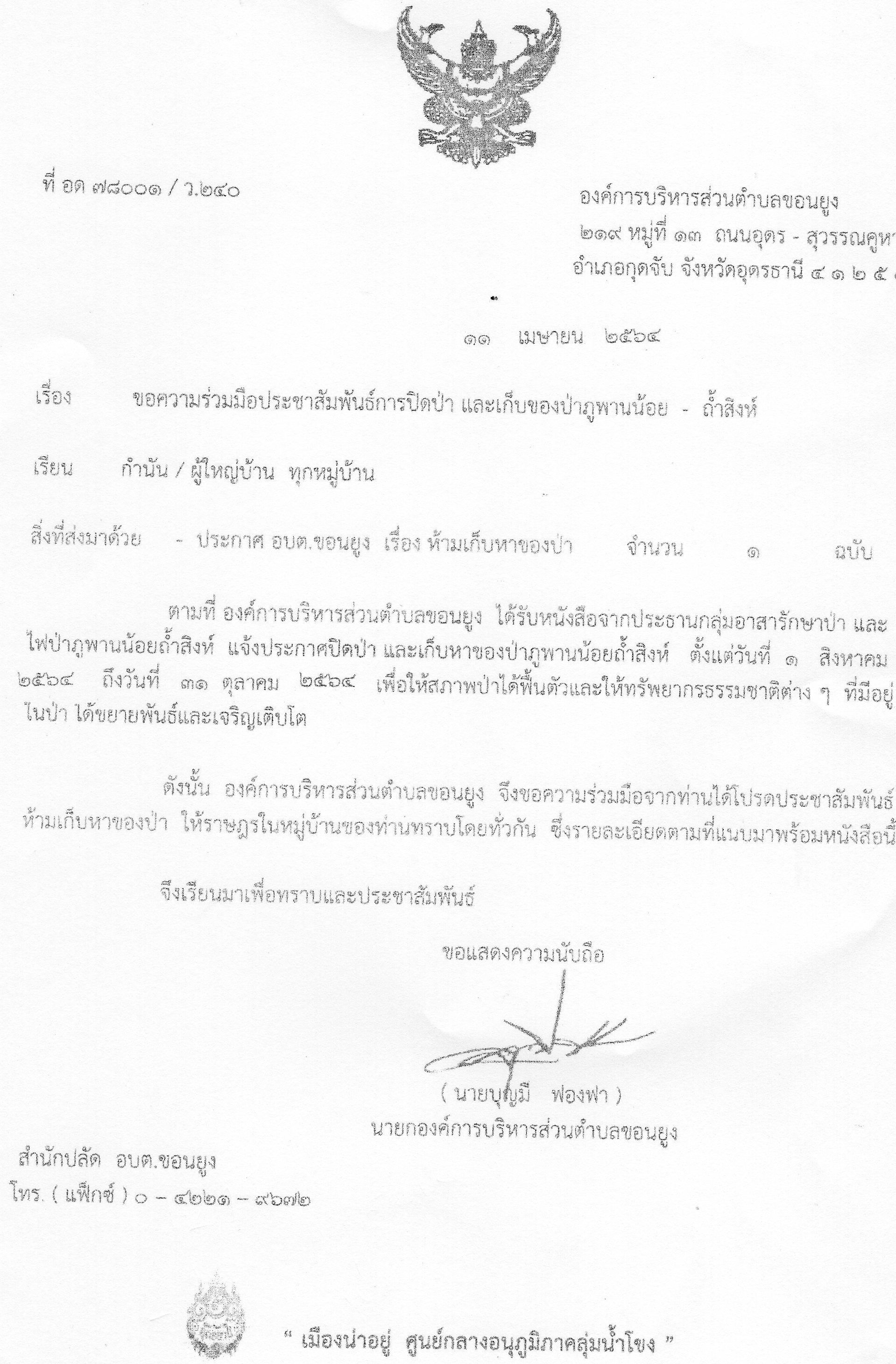 ขอความร่วมมือประชาสัมพันธ์การปิดป่า และเก็บของป่าภูพานน้อย - ถ้ำสิงห์